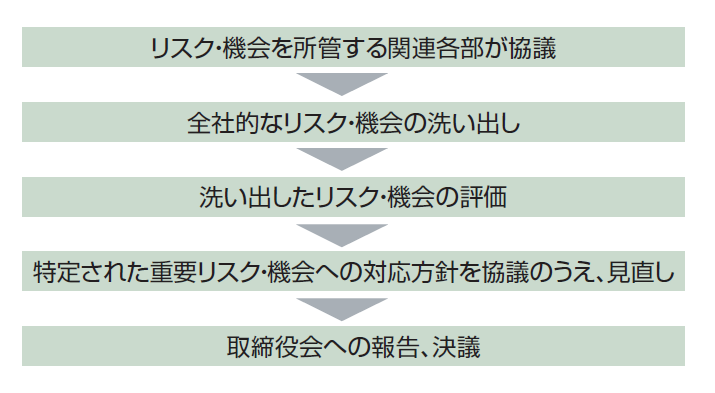 当社では、サステナビリティ関連のリスクおよび機会を関連部門において協議し、全社的なリスクと機会を洗い出し、評価を実施したうえで、重要なリスクおよび機会を特定しています。そのなかで、気候変動リスクおよび機会については、所管する関連各部が協議したのち、サステナビリティ委員会にて、全社的リスクの洗い出し、評価が行われます。特定された重要リスクおよび機会については、サステナビリティ委員会で協議して対応方針や戦略・施策の立案、および見直しを実施します。その後、議論された内容は取締役会へ定期的に報告され、決議しています。