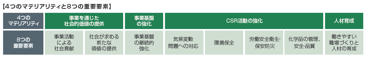 この基本方針に基づき、「事業を通じた社会的価値の提供」「事業基盤の強化」「CSR活動の強化」「人材育成」の4つのマテリアリティを特定し、取り組みを進めています。