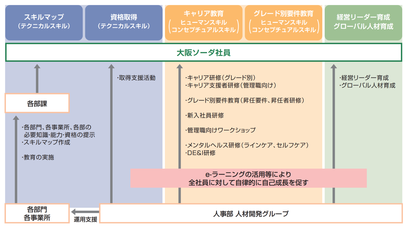 当社グループでは、社員全員が人事ポリシーを実現するために、学習目標の設定、育成面談の実施、社員として求められる役割を果たすための自律的な能力開発を重視し、教育計画を策定しています。その一環として、人事部が各部門、各事業所と連携し、人材育成の指針となる能力要件(役割や業務に応じた知識・スキル)を設定し、それらを習得するための自主的な学習支援ツールや研修制度を整備しています。
