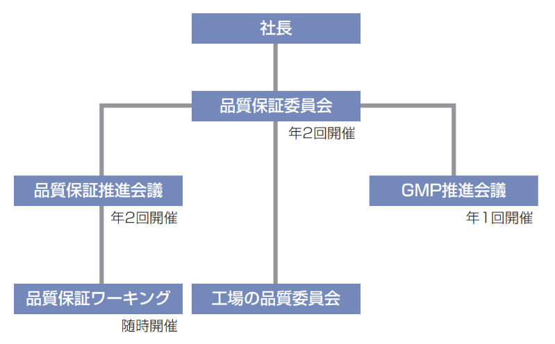 各工場において、年2回の品質監査を行って、品質トラブルのフォロー、品質関連の取組み状況の確認などを行っています。また、同時に品質保証部門の重要性や役割などについて品質コンプライアンス教育を実施し、品質に関する意識レベルの向上を図っています。さらに、QC工程表の活用、傾向管理の実施、直行率の監視、変更管理の運用などの取り組みを行い、品質保証レベルの向上につなげています。外部委託製品について、委託先の監査を通じて適正な品質保証に取り組んでいます。また、サプライヤーについて、品質監査等を通じて、原料の適正な品質の確保に取り組んでいます。